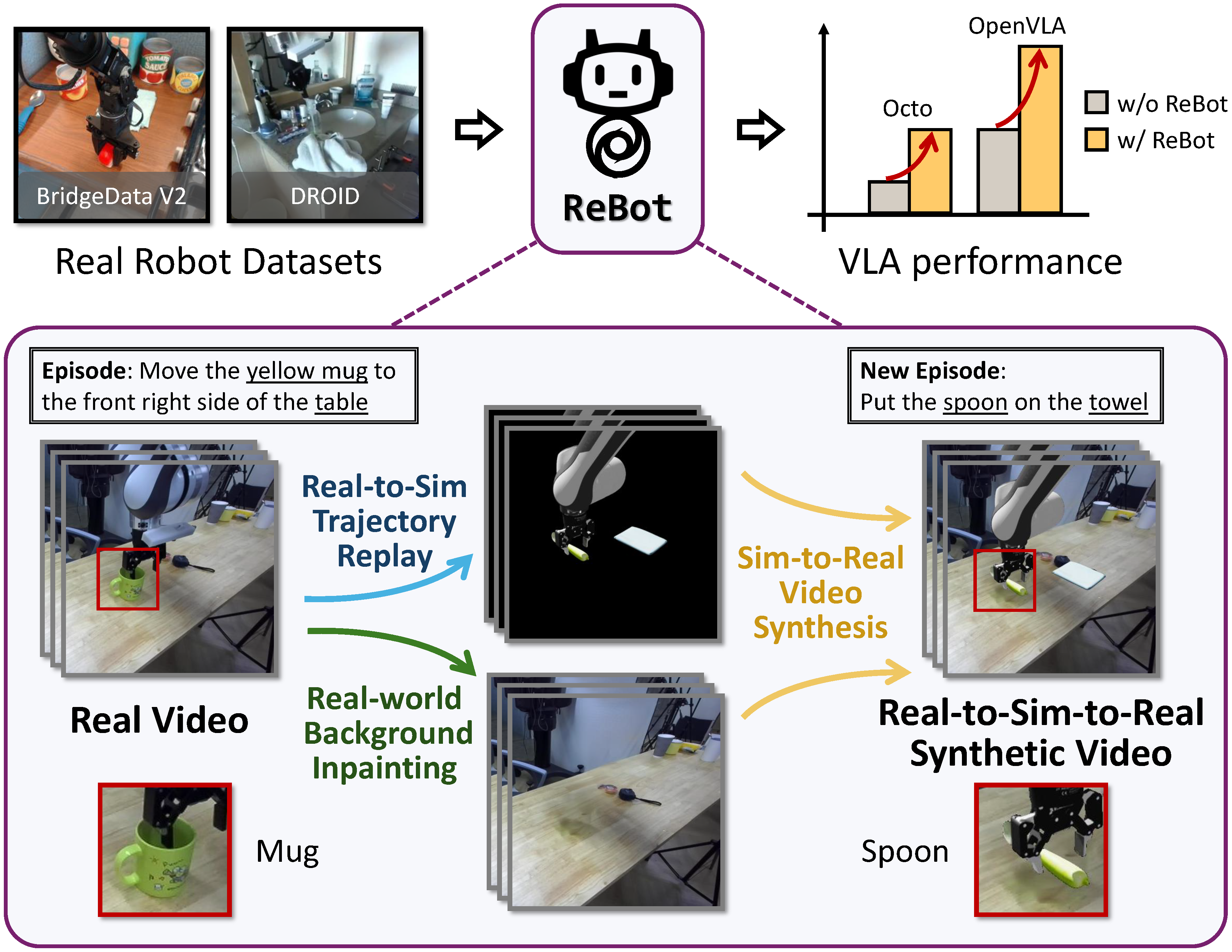 ReBot: Scaling Robot Learning with Real-to-Sim-to-Real Robotic Video Synthesis